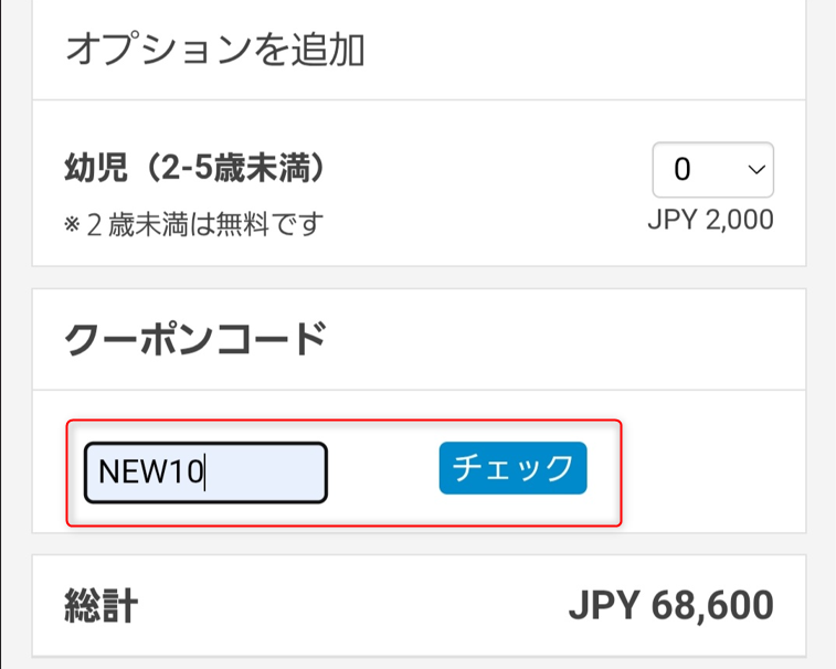 Coupon code when making a reservation at a participating facility[NEW10Only enter the [*].