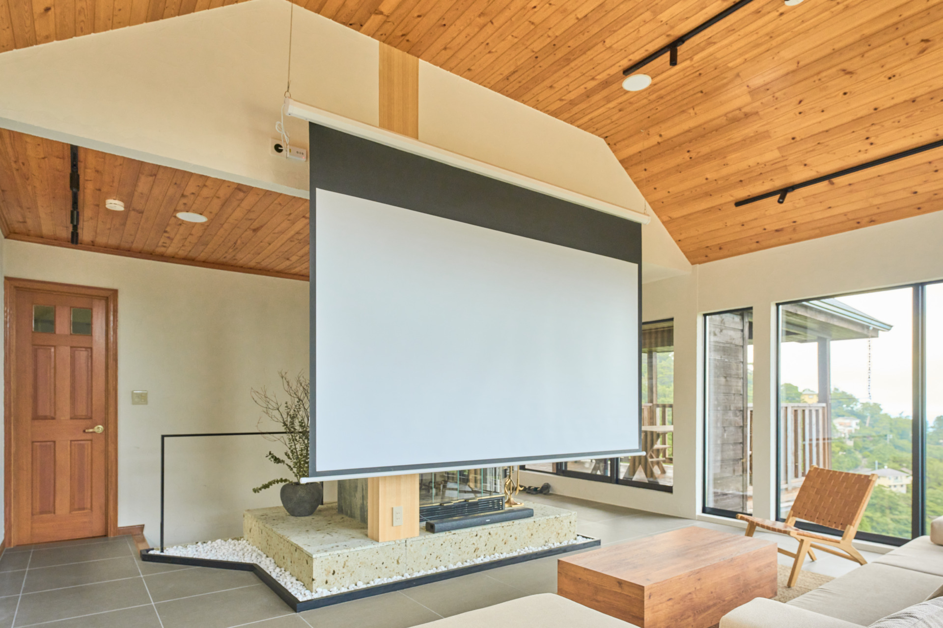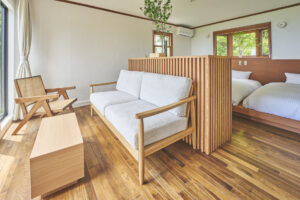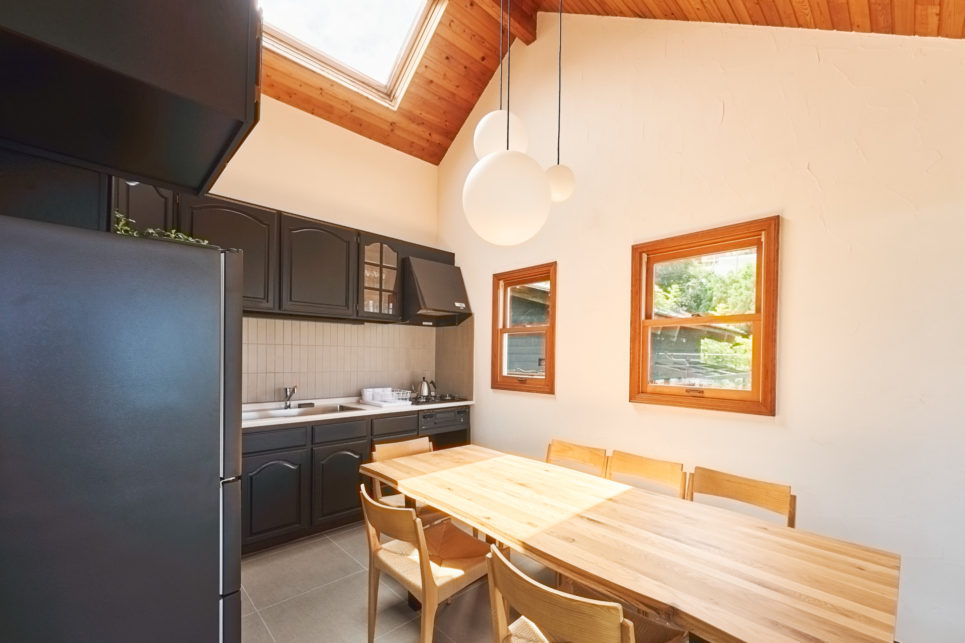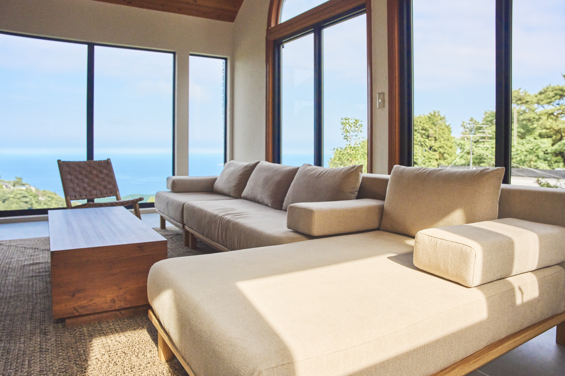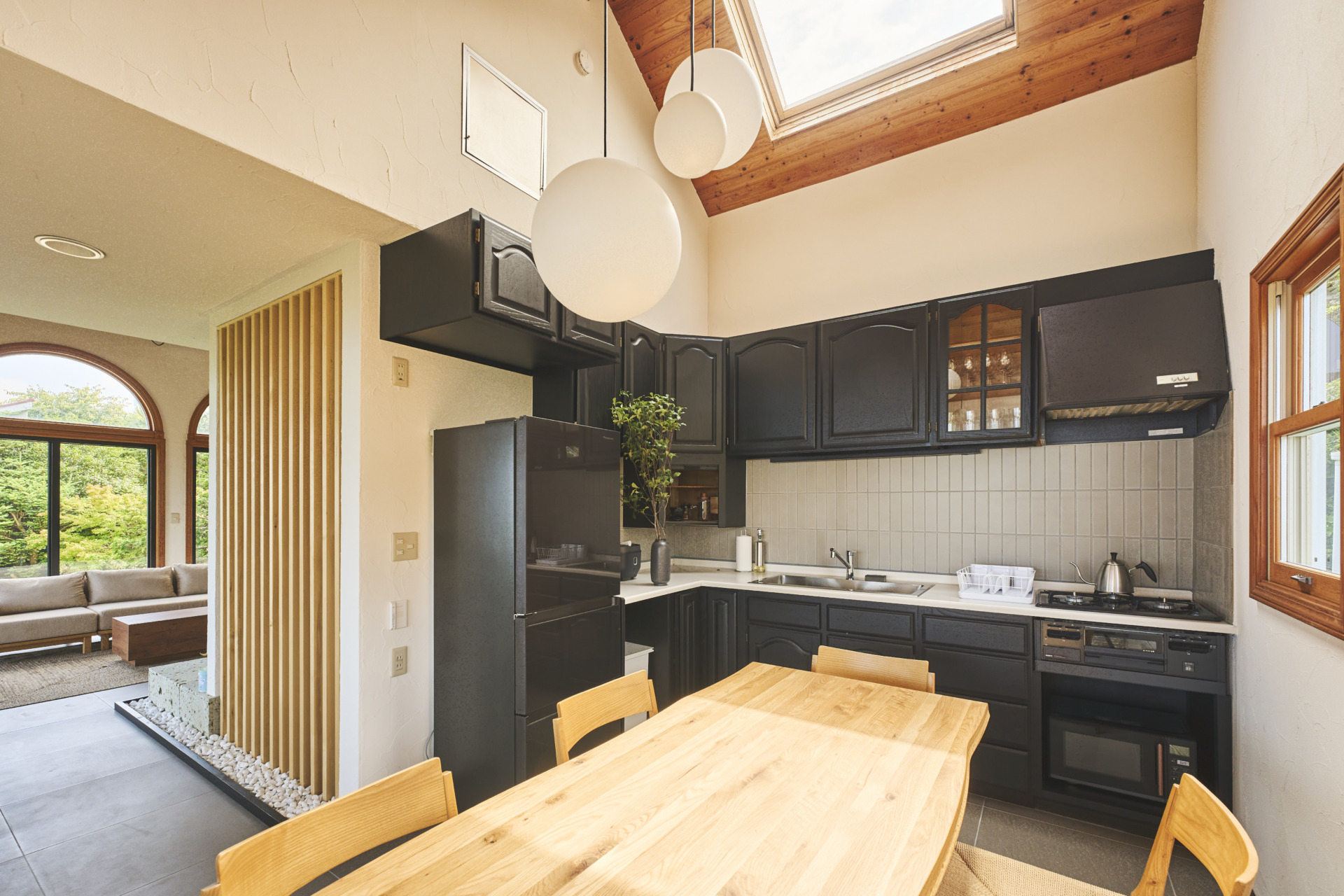 2025年夏にリフォームされたばかりの当宿は、天井が高く開放感のあるリビングが特徴。大きな窓越しに広がる景色を眺めたり、夜にはプロジェクターで映画を楽しんだり、過ごし方はあなた次第。
