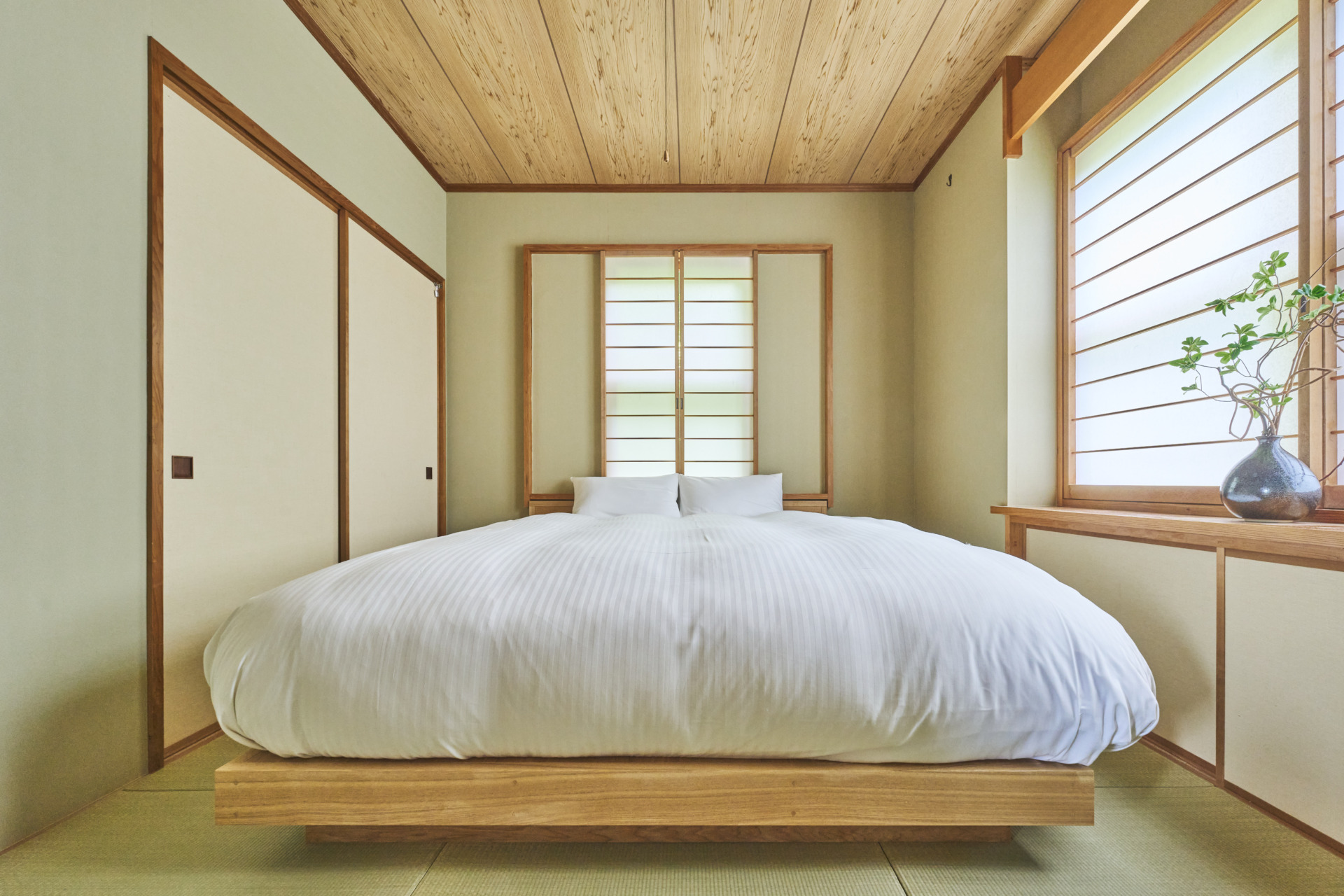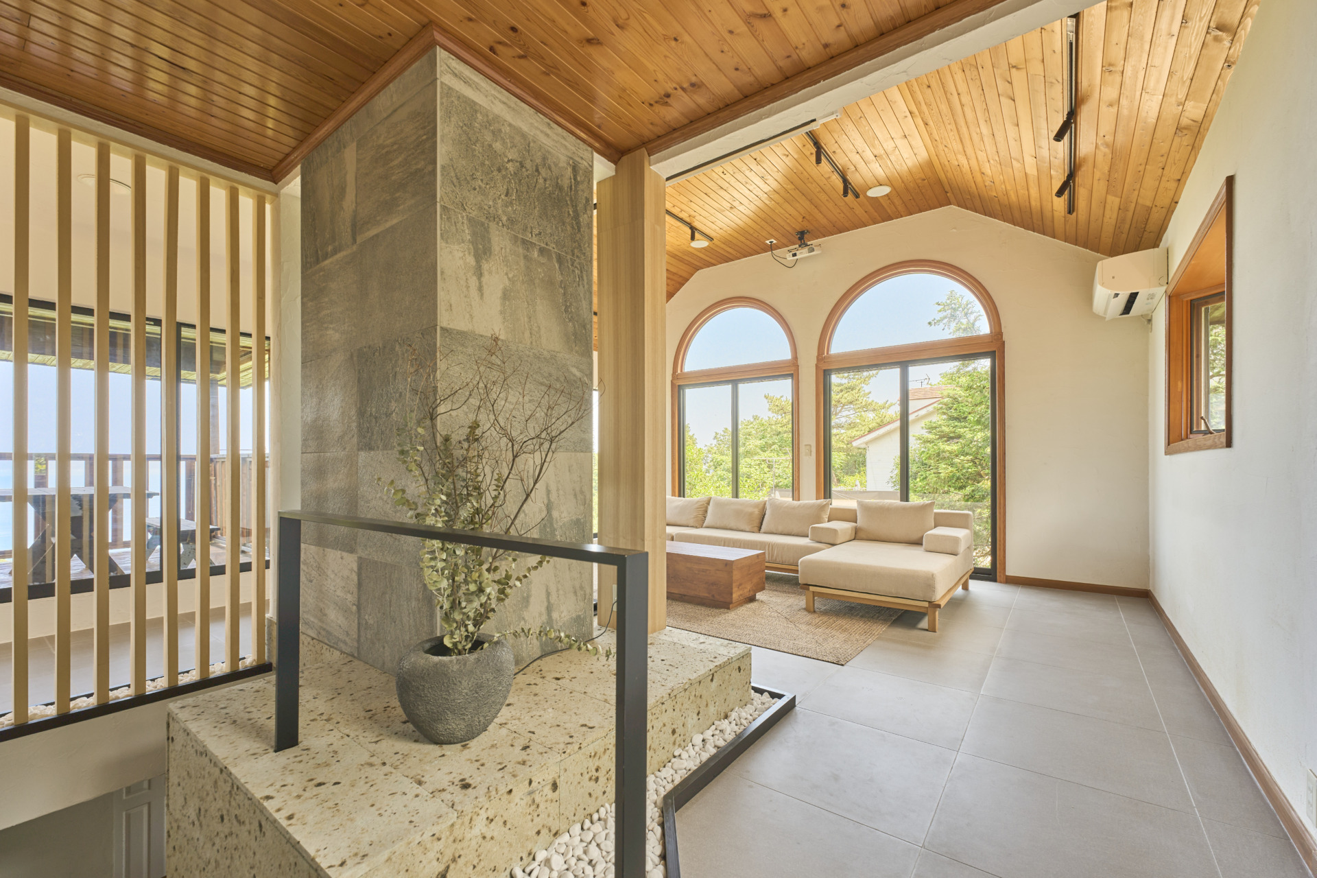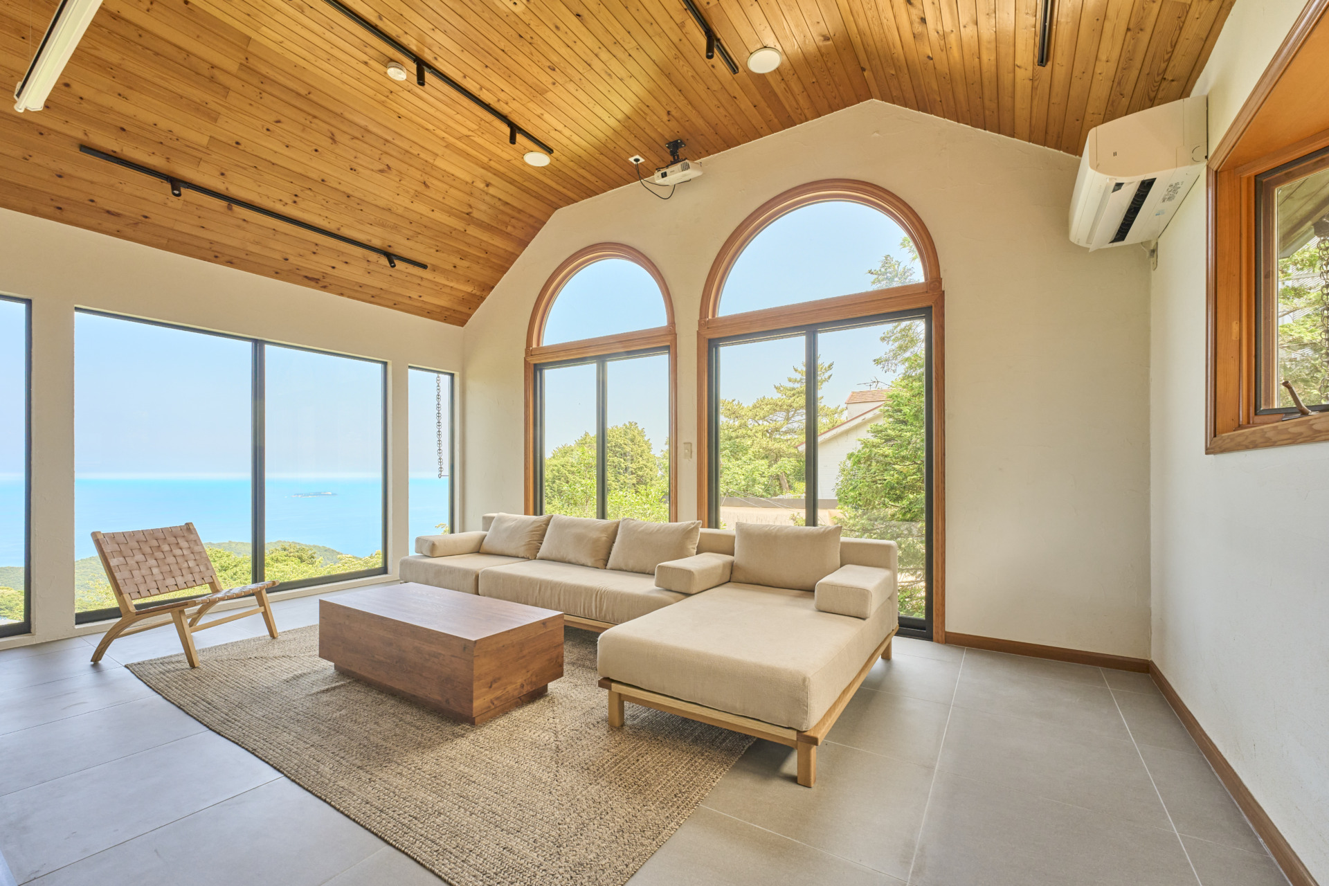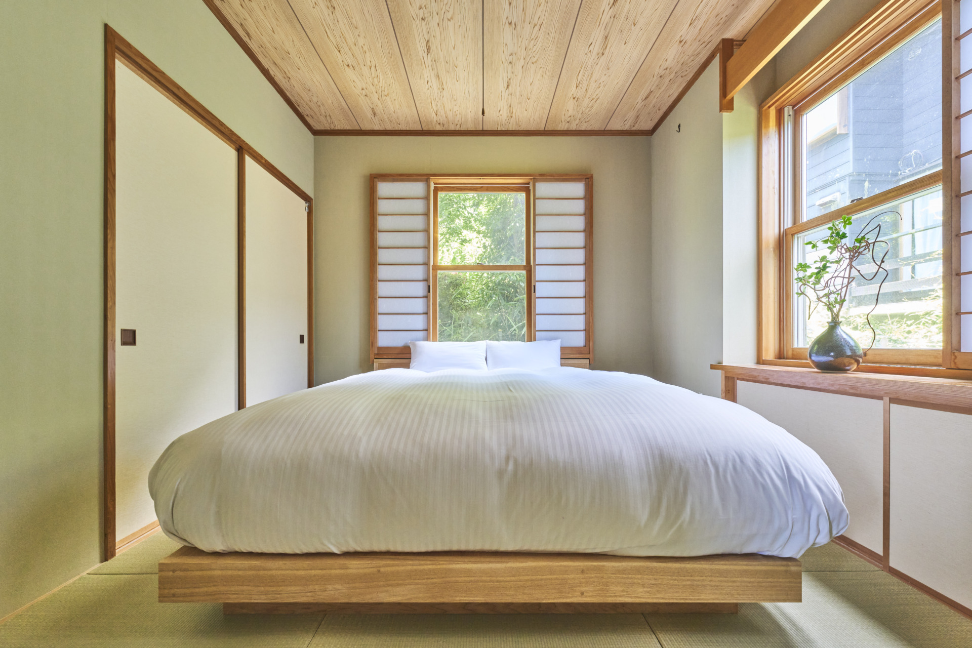 2025年夏にリフォームされたばかりの当宿は、天井が高く開放感のあるリビングが特徴。大きな窓越しに広がる景色を眺めたり、夜にはプロジェクターで映画を楽しんだり、過ごし方はあなた次第。