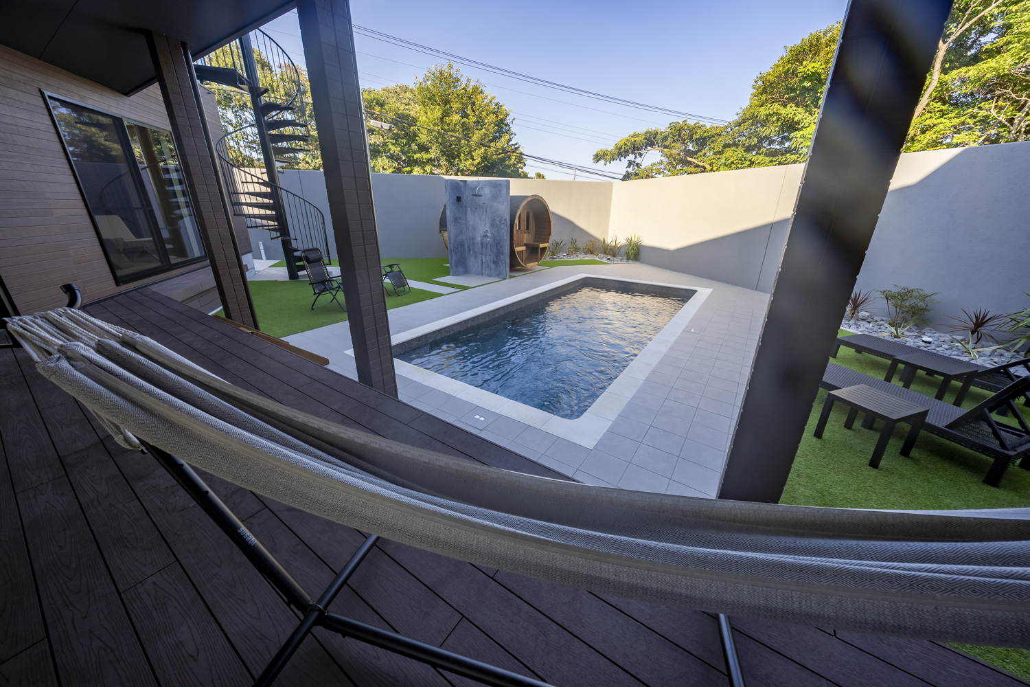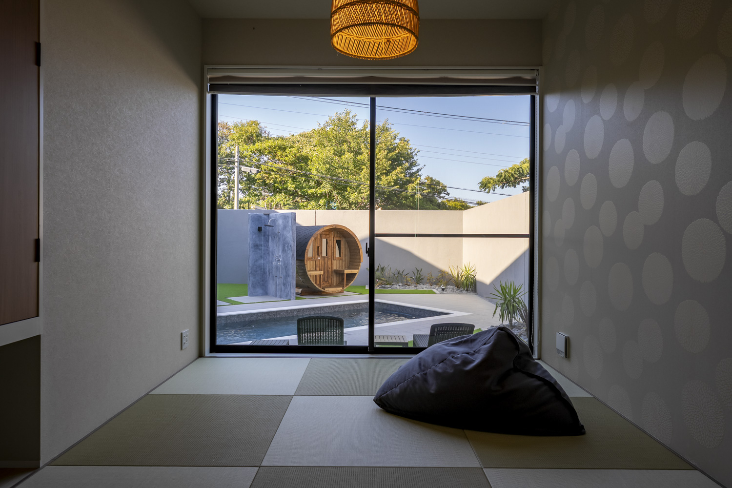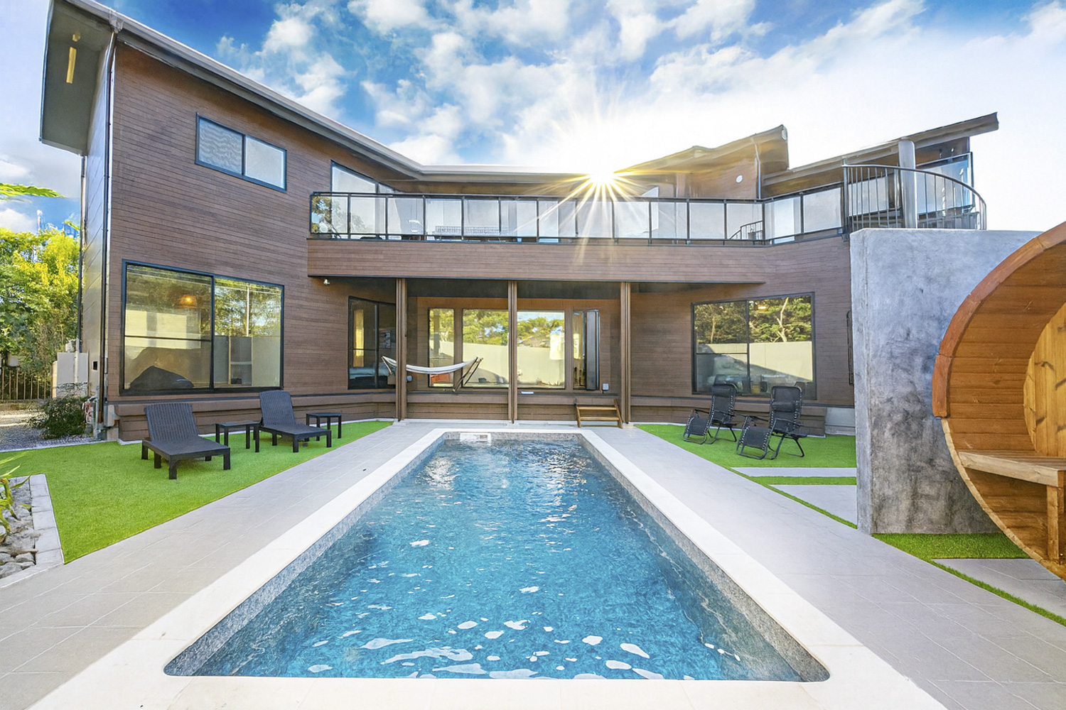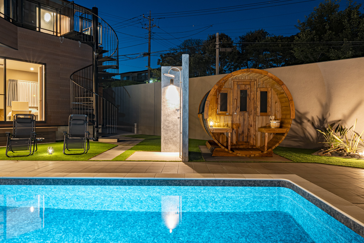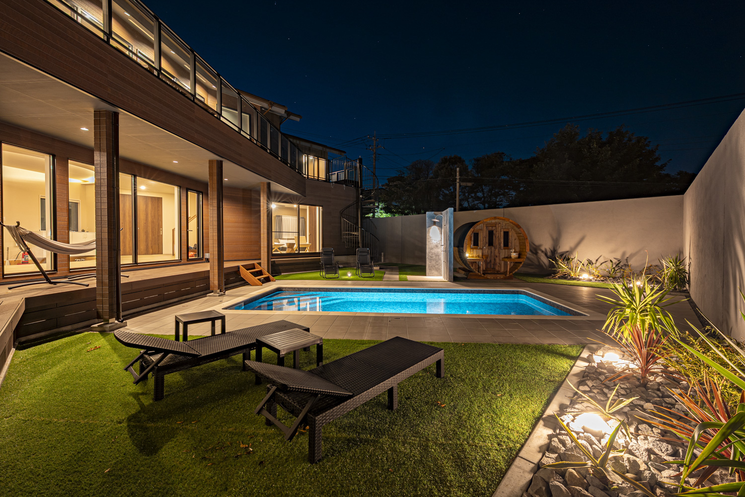 伊東市富戸に佇む一棟貸切の宿「SANA 伊豆大室山-Pool Villa-」は、プライベートプール付きの贅沢な貸別荘です。
