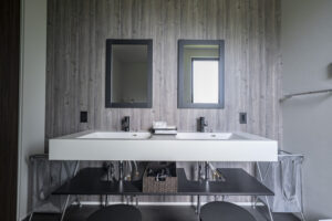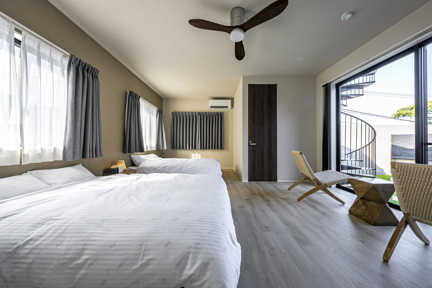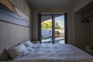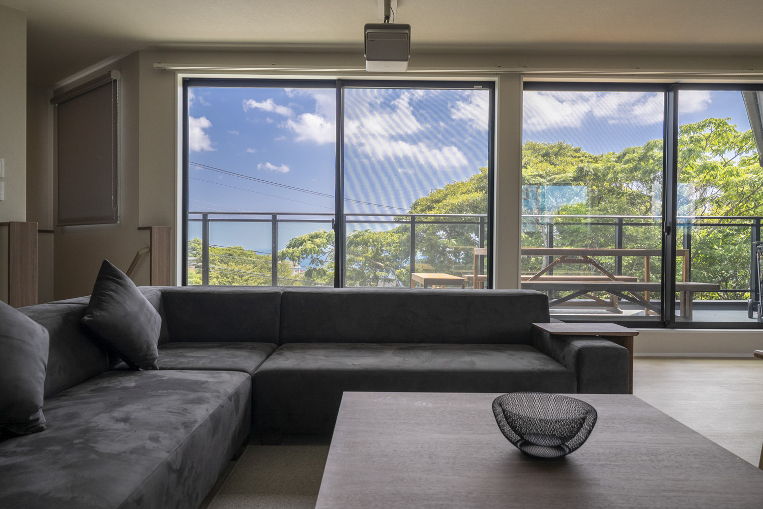 大きく開かれた窓越しに見える緑や室内に差し込む自然の光により、非日常の解放感を味わうことができる当宿。